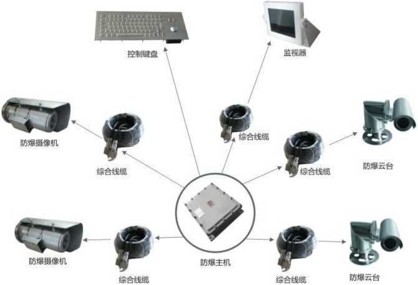 前端视频采集点釆用我公司的BNK-2系列防爆摄像仪(该摄像仪为不锈钢材质,内置高清一体化摄像机可选碳钢),其中固定点部分采用能调节的支架,移动点部分采用全不锈钢防爆电动云台。
